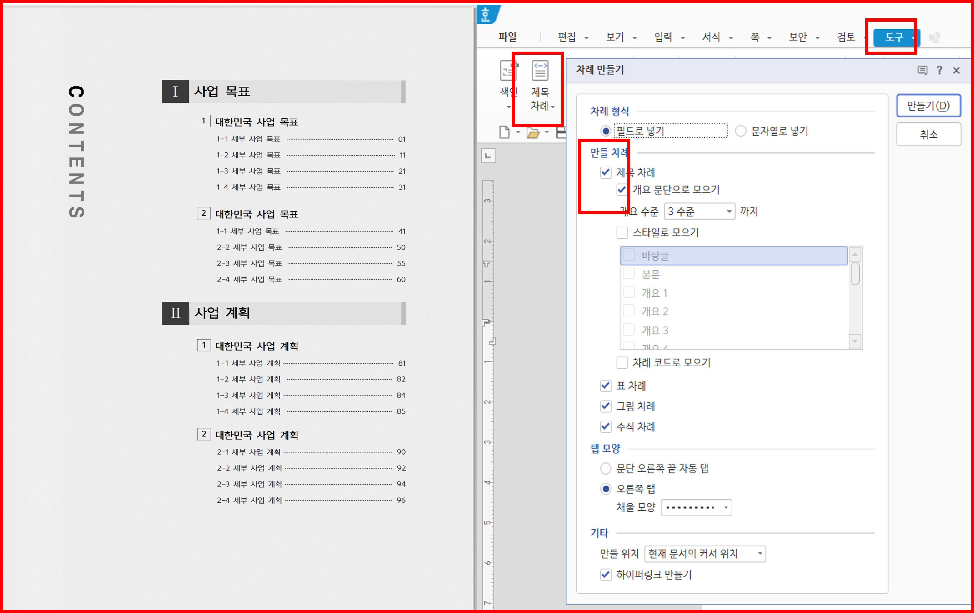 특히 관리운영계획서나 사업제안서처럼 20페이지 이상 문서에서는 자동목차는 필수다.