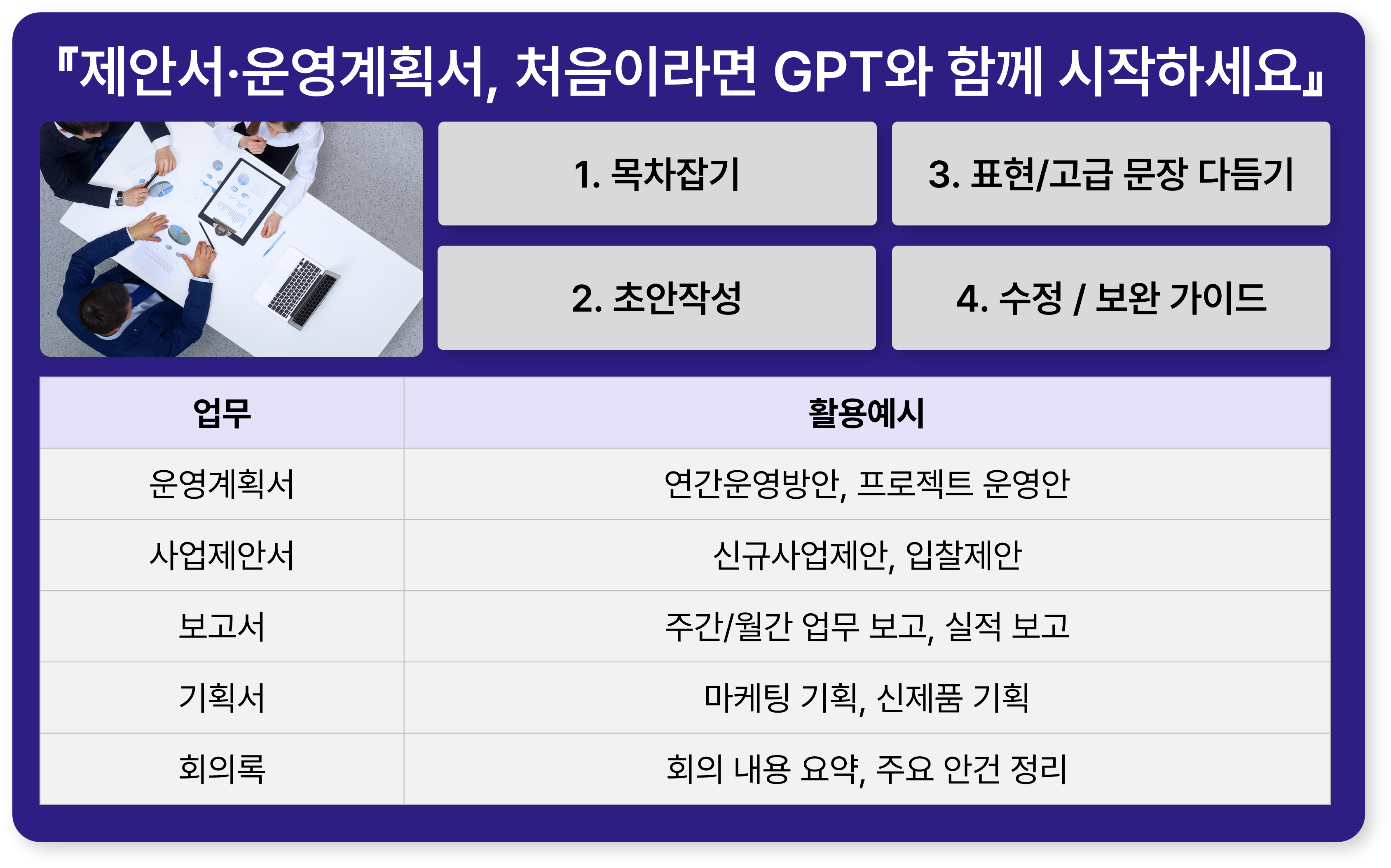 GPT는 특히 제안서와 사업계획서, 운영계획서 같은 '구조가 필요한 문서'에 탁월합니다.